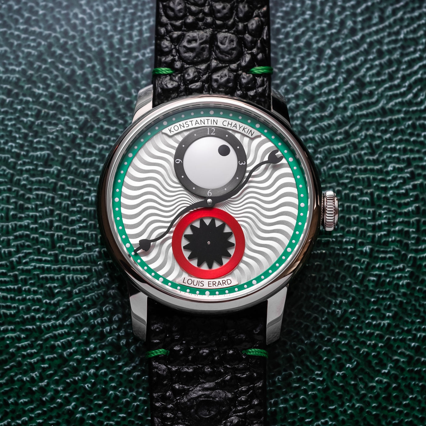 Shiny green hour-circle, silver lower plate with sunray wave pattern, anthracite circular satin-finished hour flange, shiny red seconds flange, circular satin-finished cartouches with black logos