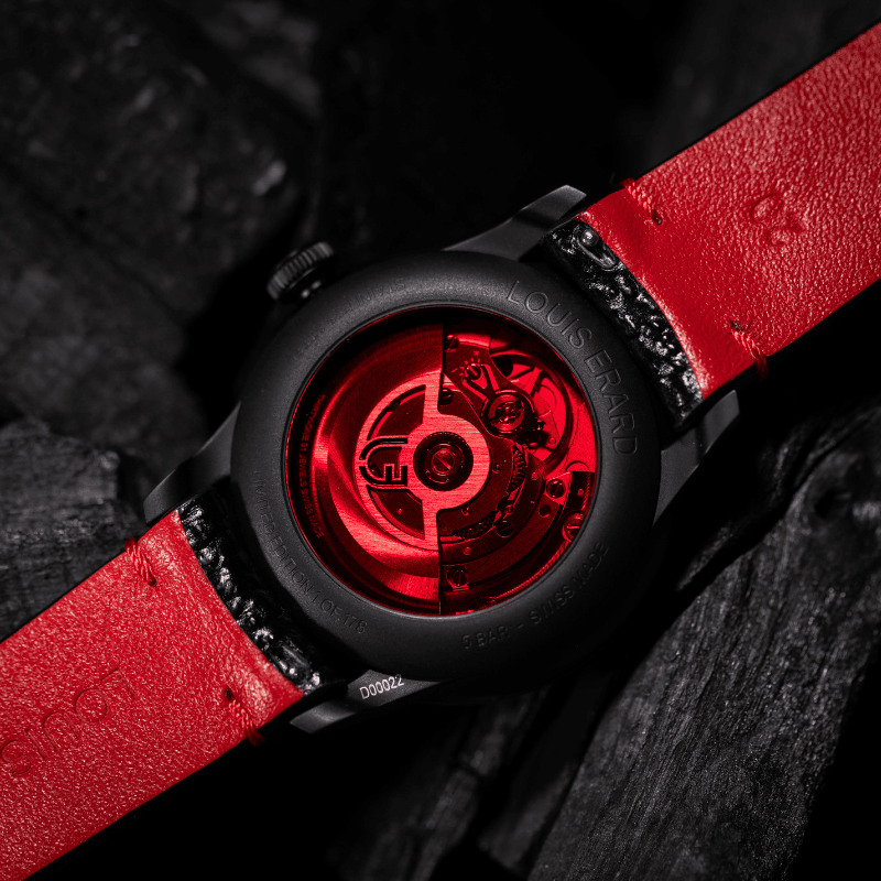 Matt black hour-circle, anthracite lower plate with sunray wave pattern, anthracite circular satin-finished hour flange, shiny red seconds flange, circular satin-finished cartouches with white logos