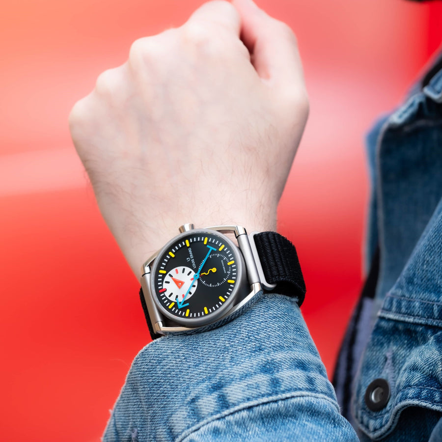 Once again, the Alain Silberstein’s signature touch is instantly visible: a large blue arrow hand for the minutes, a red triangle for the hours, and a small yellow serpentine hand for the seconds. Telling the time becomes separated into its different parts in a joyful language, sophisticated and childlike at the same time, with the artistic and philosophical depth that characterises all Silberstein’s work: it is a game of proportions, with references ranging from Bauhaus to the rich history of watchmaking.