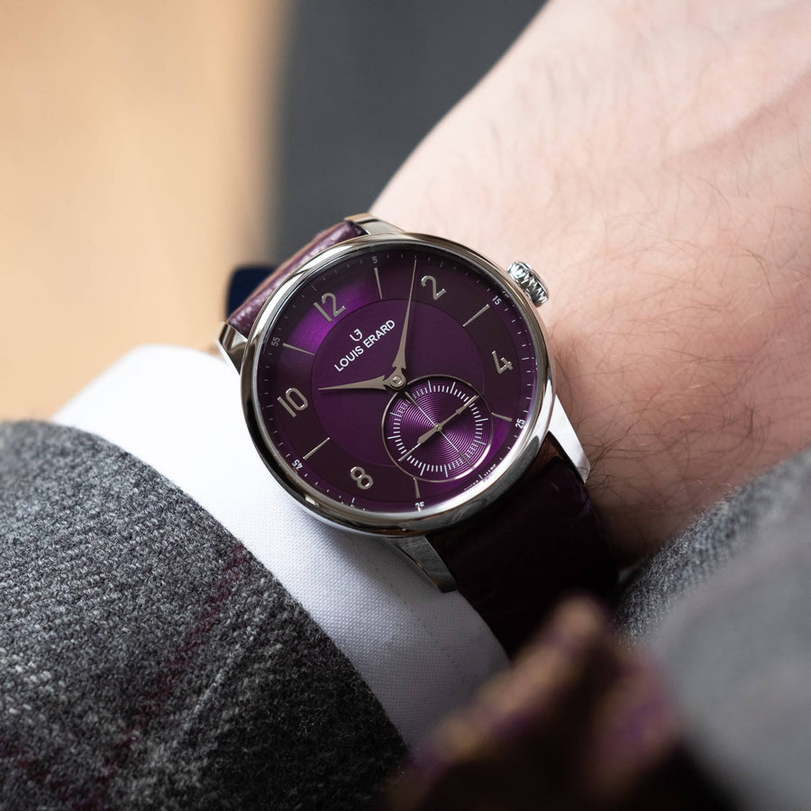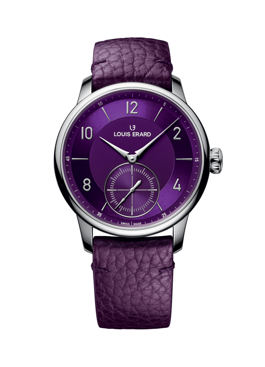 The colour purple is a subtle reminder that contemporary watchmaking, even if it remains centred on its values of durability, is also made up of trends and sometimes allows itself to go beyond its normal codes. Purple, enhanced by the contrast of polished hands and indexes, embodies this ability to reinvent oneself. This colour came from the top of the range; Louis Erard makes it accessible. The watch is finished with a purple grained calf leather strap with tone-on-tone attachment points and blue grained calf leather lining.