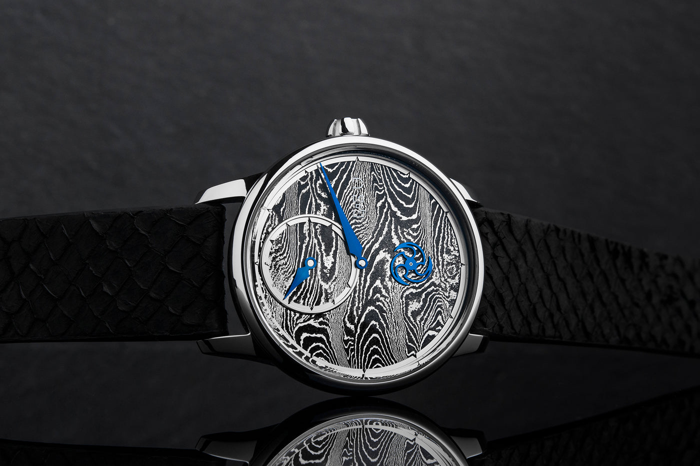 それぞれのタイムピースは、エレガントなプロポーションの39mmスティールケースに収められ、ダマスカス鋼の文字盤を縁取ることで、真に唯一無二の時計となっています。コニー・パーソンによって鍛造され、パトリック・シェーグレンによって丹念に手作業で仕上げられた文字盤は、独自の浴処理によってコントラストを際立たせ、グレーのトーンを明るくし、ブラックのトーンを深くすることで、印象的な視覚的な深みを生み出しています。