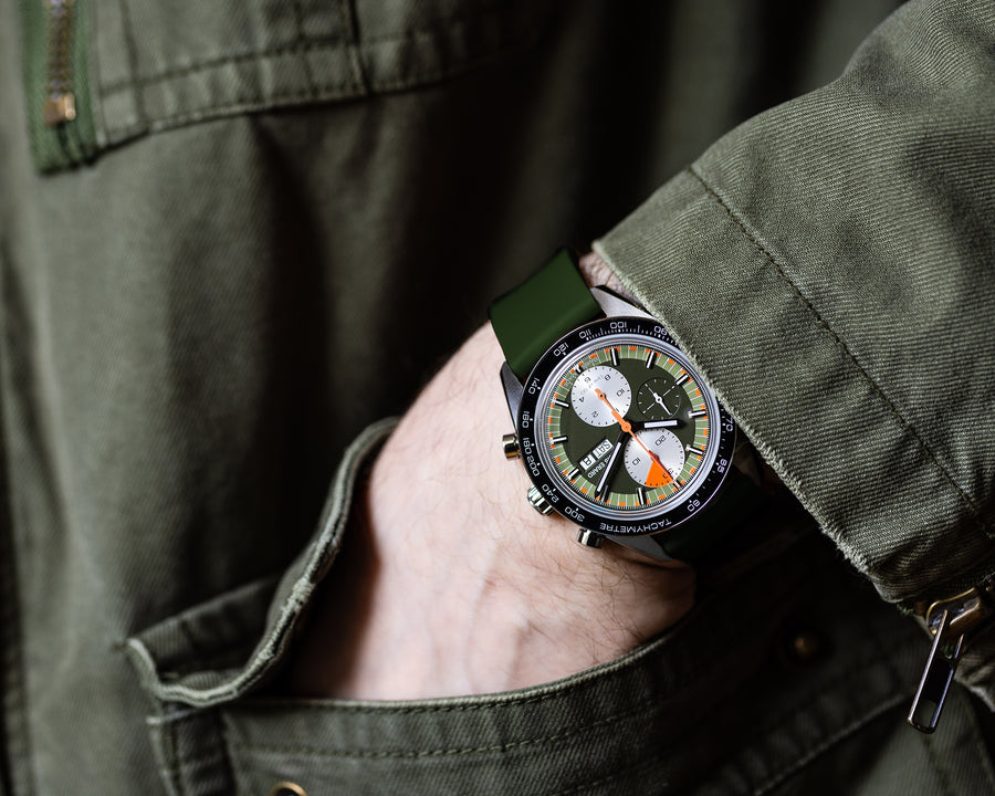 マットカーキ、ホワイト転写、オレンジ転写のマットライトカーキ外装ミニッツトラック、グリーンスーパールミノバ発光の面取りロジウムメッキアワーマーカー、9時位置にカーキカウンター、12時と6時位置にブラックとオレンジ転写のマットシルバーカウンター、3時位置に曜日/日付ウィンドウ