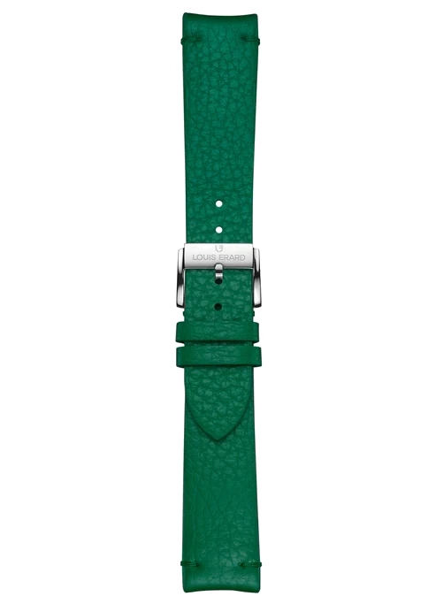 トーン・オン・トーンのステッチが施されたグリーンのグレイン カーフ レザー、ブルー グレイン カーフ レザーの裏地、ポリッシュ仕上げのステンレススチールのピン バックル、機能的なキャッチ スプリング バーによりストラップを素早く交換できます。時計屋を訪ねる必要はありません。