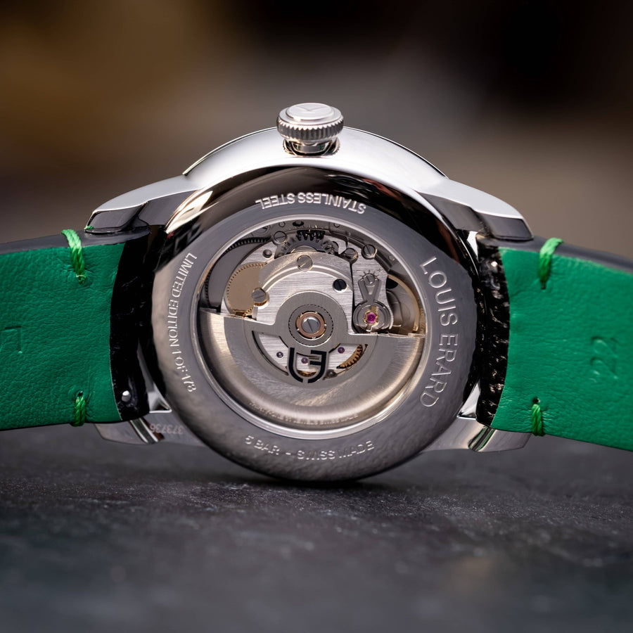 ケースはヴィンテージの懐中時計を反映し、サファイアクリスタルで現代化されており、シルバーの文字盤は微妙なコントラストとレベルによって 1950 年代の魅力を呼び起こします。
