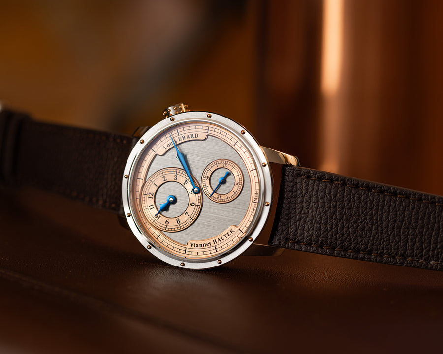 ルイ・エラールとヴィアネイ・ハルターは、スチームパンクの職人技とアンティクア特有のコードを大胆に融合させたレギュレーターを製作しました。ルイ・エラール レギュレーターのデザインは、ハルターの特徴的なスプリットタイムサブダイヤルと完璧に調和しています。その結果、脱構築的なエネルギーが脈打つ時計が誕生しました。この時計は現実とフィクションの間を旋回し、時間と空間の境界を超越します。