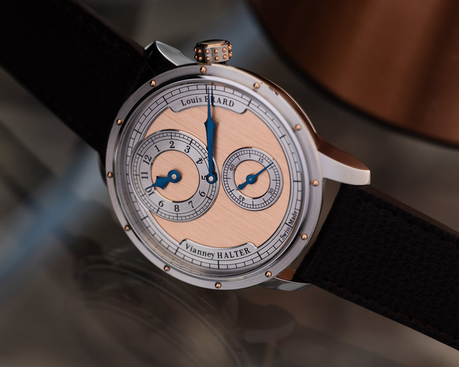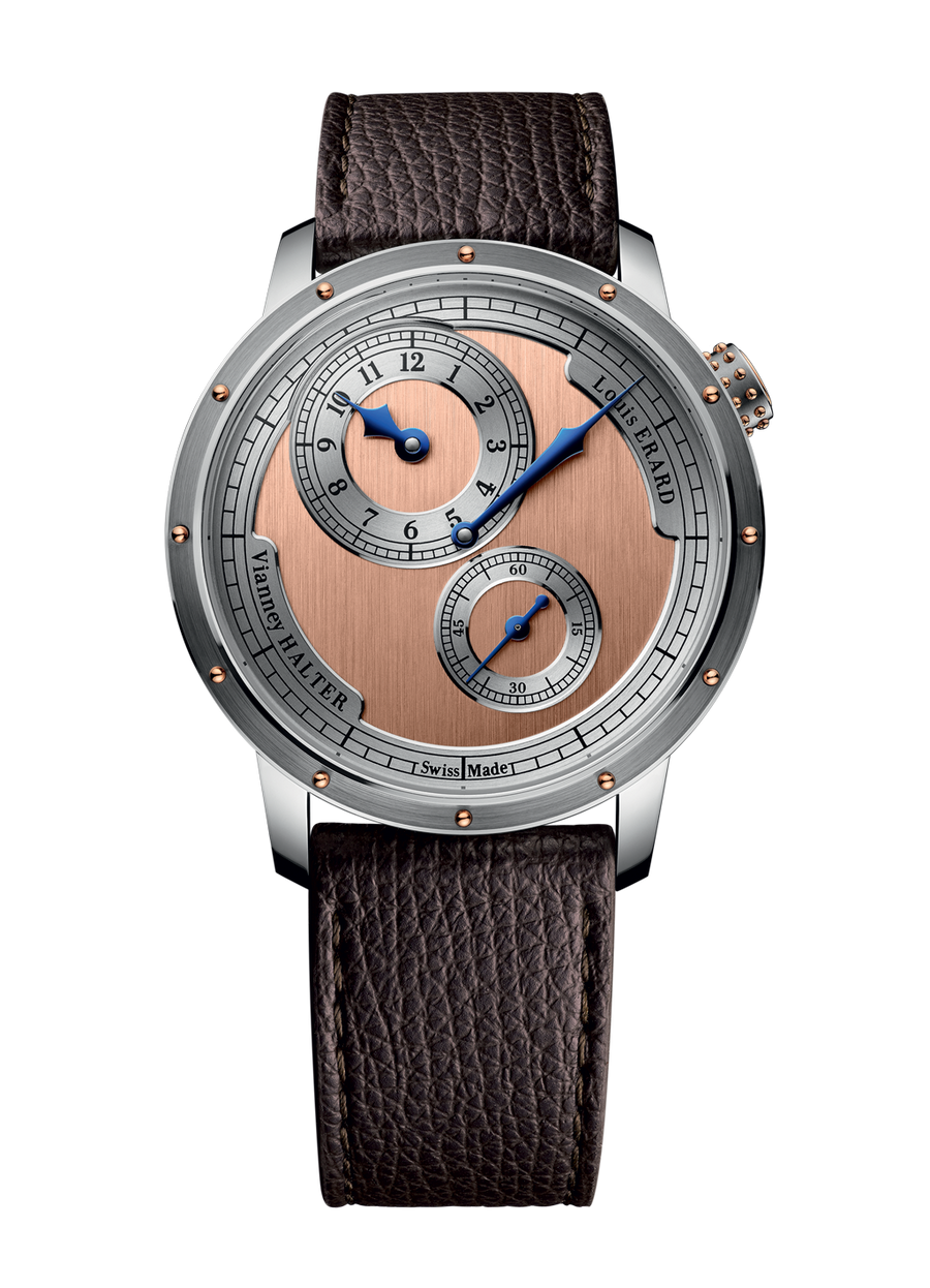 ルイ・エラールとヴィアネ・ハルターは、スチームパンクの職人技とアンティクア特有のコードを大胆に融合させたレギュレーターを製作しました。ルイ・エラール レギュレーターのデザインは、ハルターの特徴的なスプリットタイムサブダイヤルと完璧に調和しています。その結果、脱構築的なエネルギーが脈打つ時計が誕生しました。この時計は現実とフィクションの間を旋回し、時間と空間の境界を超越します。