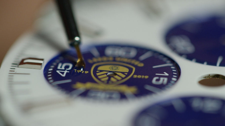 白と青のLUFC 100周年ダイヤル、LUFC 100周年記念の紋章とLUFCスタジアムのレンガパウダーを施した9時位置の特別カウンター、アップリケにスーパールミノバ