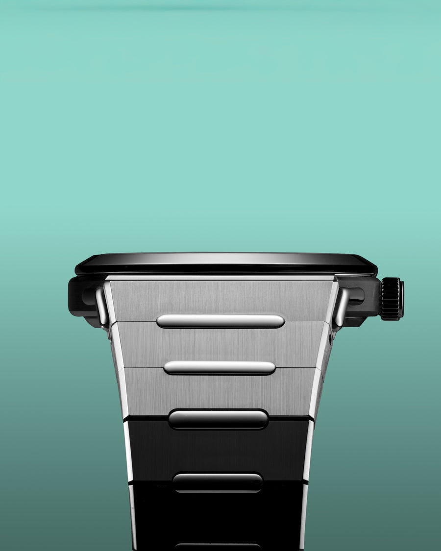Satin-finished titanium and polished stainless steel, Torx screws at bracelet attachment