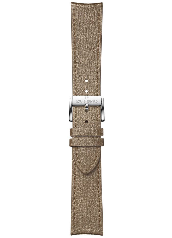Brown grained calf leather with tone-on-tone stitching, brown grained calf leather lining, polished stainless steel pin buckle, functional catch spring bars enabling the strap to be changed quickly – no need to visit a watchmaker to help you.