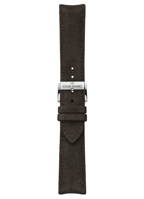 Coffee brown calf nubuck leather with tone-on-tone stitching, polished stainless steel pin buckle, functional catch spring bars enabling strap to be changed quickly – no need to visit a watchmaker to help you.
