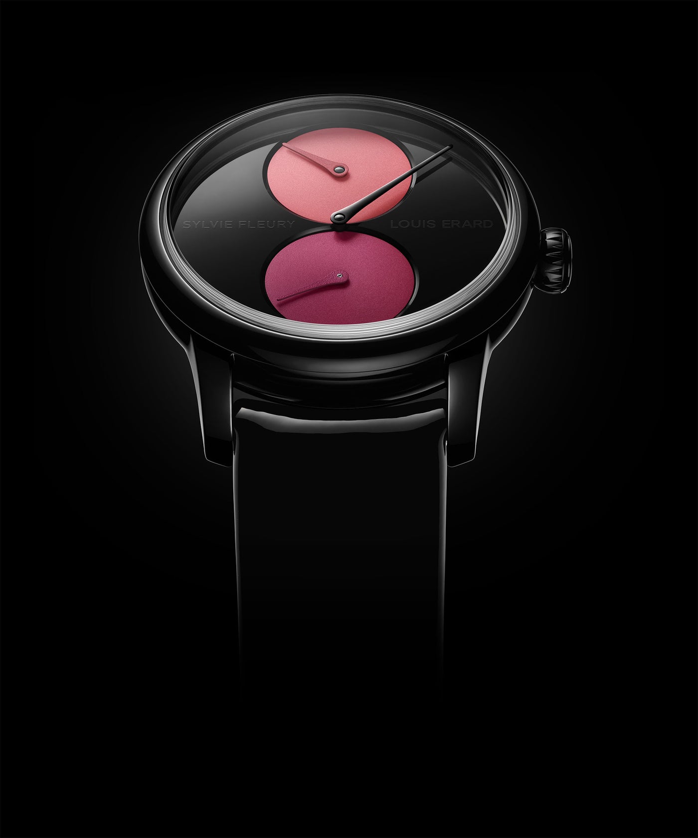 Inspired by Sylvie Fleury’s work in the form of make-up palettes: black polished lacquer dial with black transfers, matt coral domed hour counter and matt magenta domed seconds counter, Louis Erard and Sylvie Fleury logos at 3 o'clock and 9 o'clock respectively