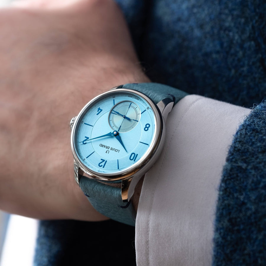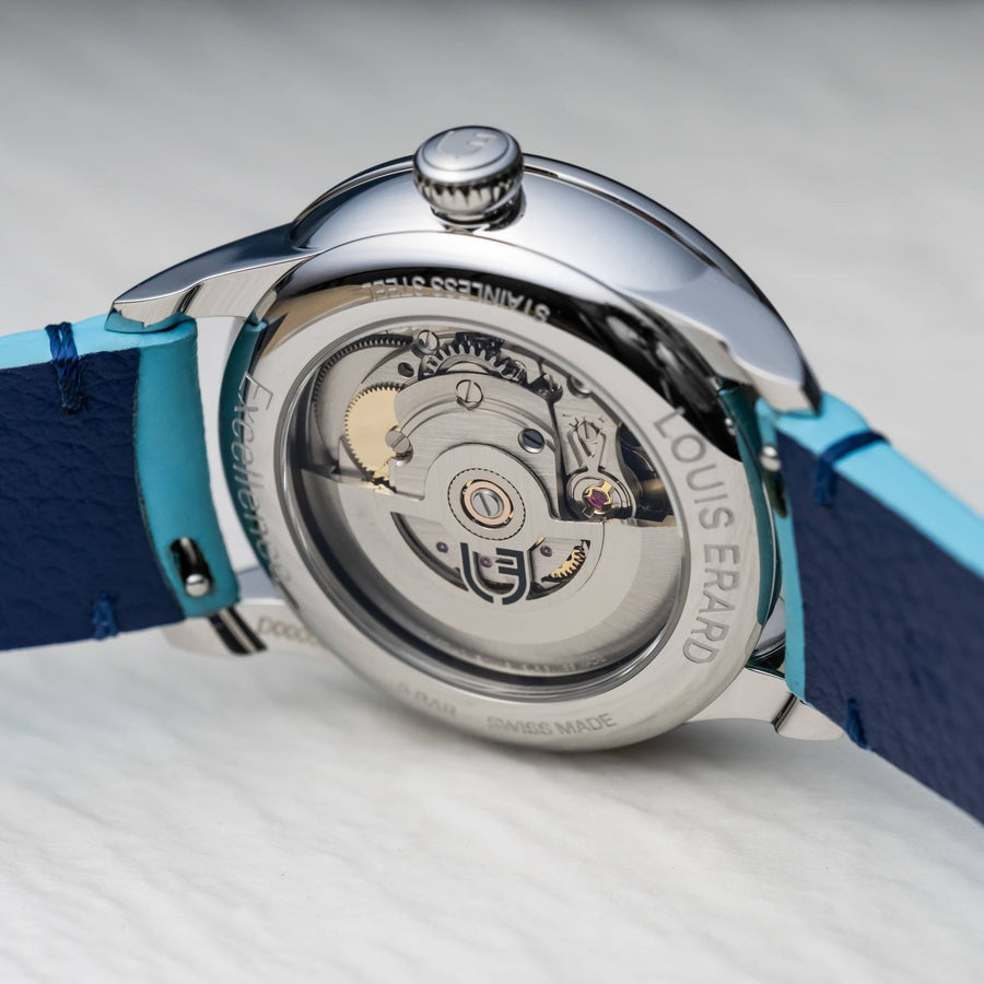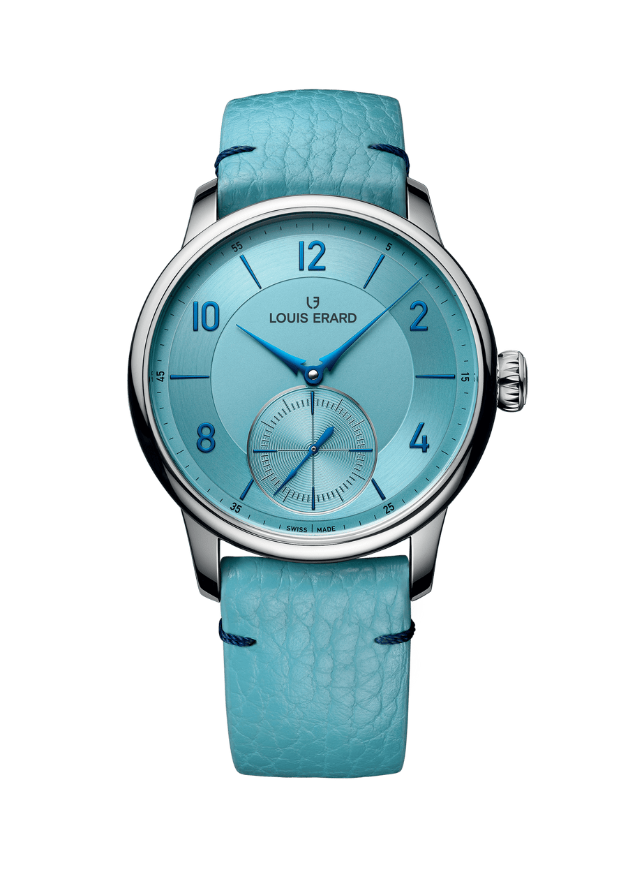 Ice blue has become a rallying point for high-end and even very high-end watches. A flashy colour to which Louis Erard adds its touch of harmony, with a hint of colour on the dark blue and polished hands, an ice blue grained calf leather strap with dark blue attachment points and its lining in blue grained calf leather. Here again, Louis Erard takes up the challenge of proving that the codes of luxury should not remain perched on unaffordable segments.