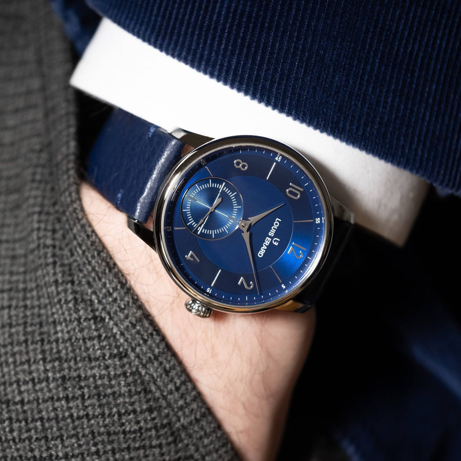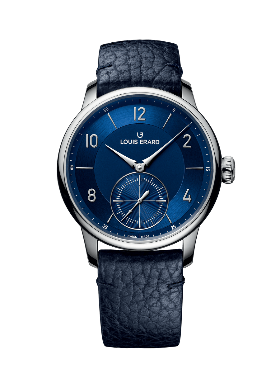 Midnight blue marks the return of a great classic. A colour that has become the long-standing travelling companion of prestige watchmaking, which is obviously part of the long history of Louis Erard, and which now returns to the heart of the collection, on a dark blue grained calf leather strap with tone-on-tone attachment points, and its blue grained calf leather lining, now a classic of the House.